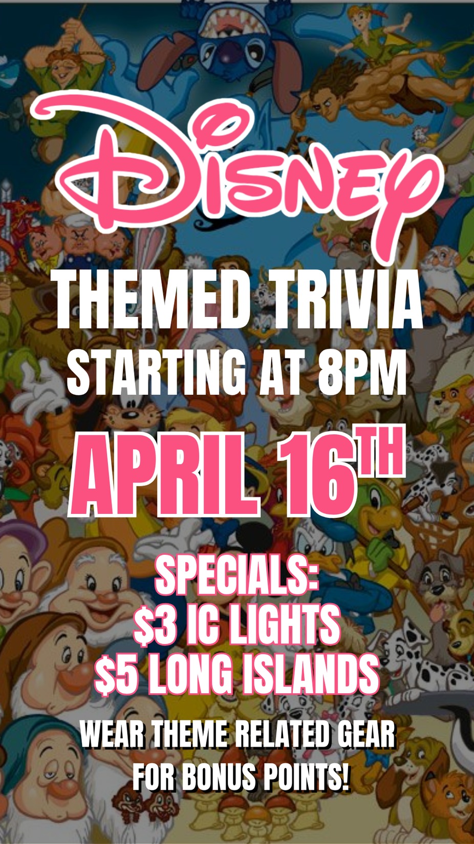 Come dressed in your favorite Disney-themed gear for a chance to earn bonus points, grab your team, and get ready for a fun, high-energy night filled with music, memories, and a little competition.