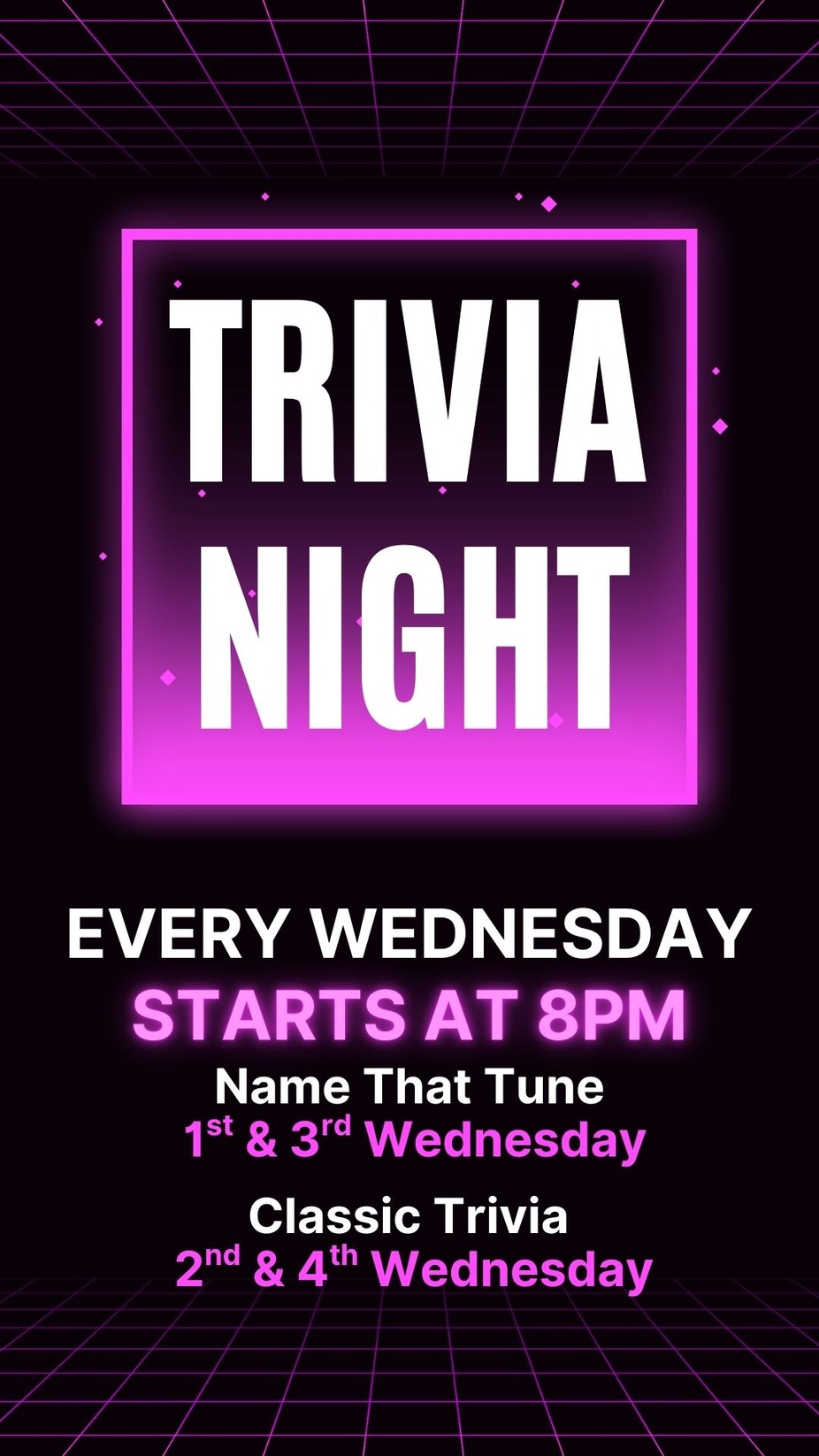 Join us every Wednesday at 8pm for Trivia Night! Put your knowledge to the test with fun rounds and great company, plus enjoy drink specials including $4.50 Blue Moons and $4 White Claws.