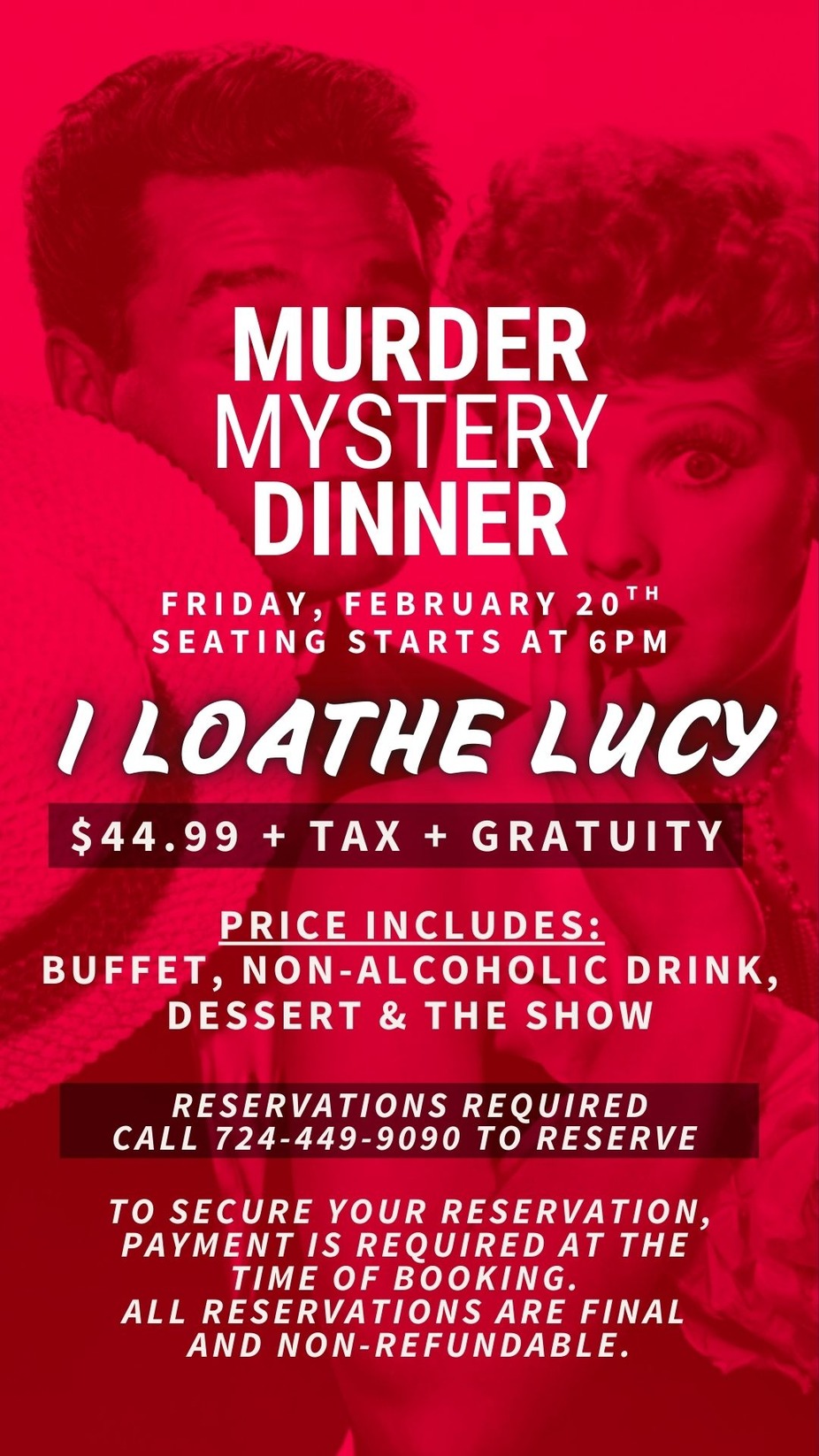 The evening includes a full buffet dinner, one non alcoholic beverage, dessert, and a live interactive murder mystery performance. Seating begins promptly at 6:00 PM on Friday, February 20.