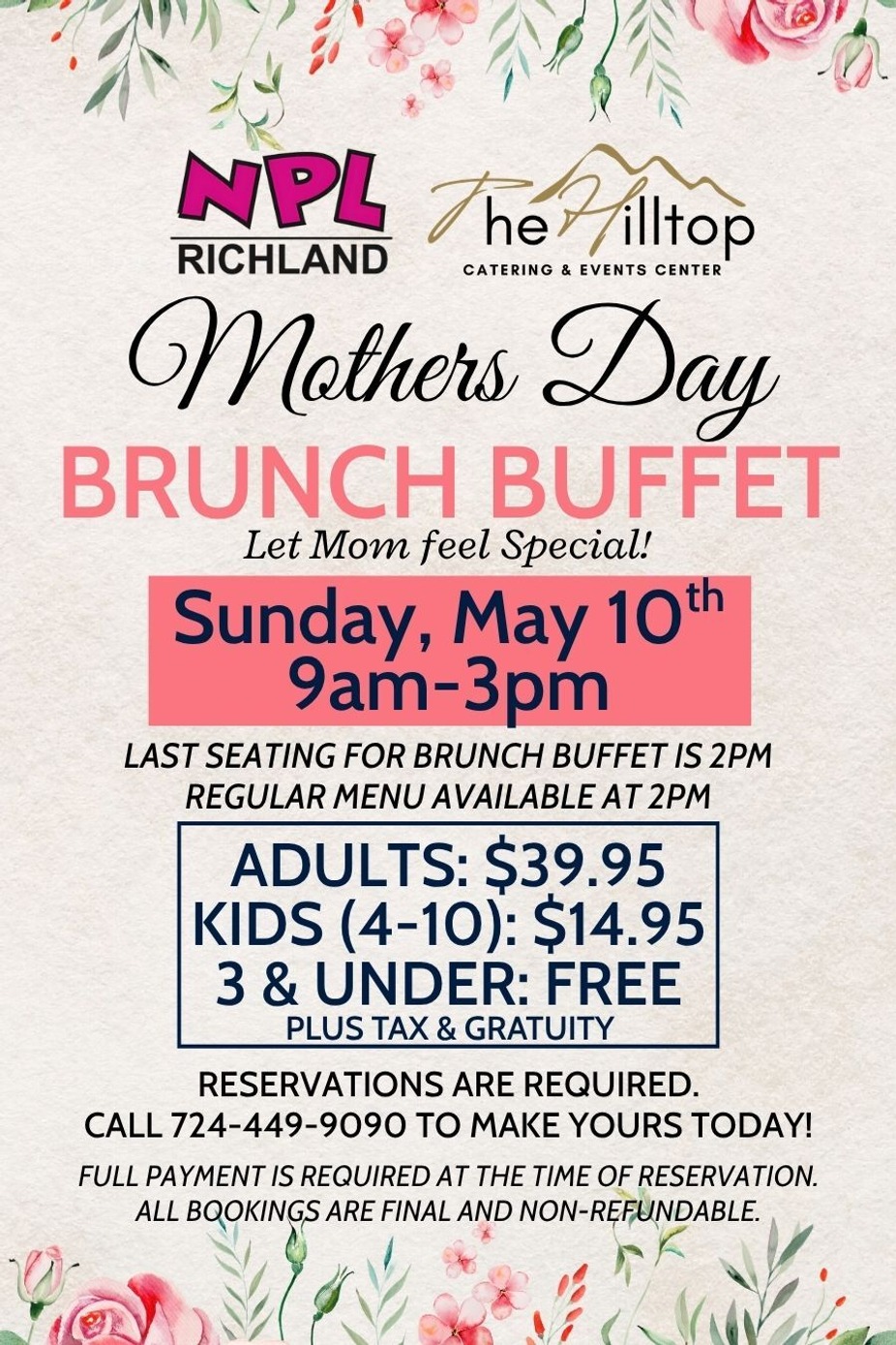 Celebrate Mother’s Day at North Park Lounge Richland with a special brunch buffet designed for gathering, relaxing, and treating mom to something she’ll truly enjoy. Join us on Sunday, May 10th from 9am to 3pm for a delicious spread of brunch favorites in a warm and welcoming atmosphere.