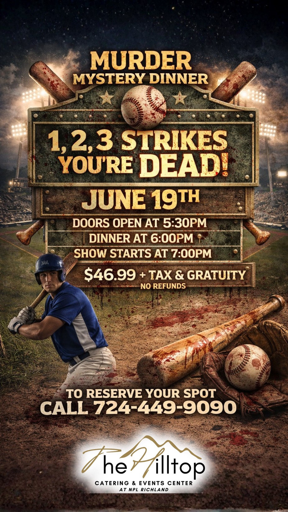 Step up to the plate for a night of suspense, laughs, and interactive fun at our Murder Mystery Dinner, 1, 2, 3 Strikes… You’re Dead! Taking place on June 19th at The Hilltop Catering & Events Center, this baseball-themed whodunit puts you right in the middle of the action. Enjoy a full dinner service before the mystery unfolds, then work alongside fellow guests to uncover clues, interrogate suspects, and solve the crime before the final out.