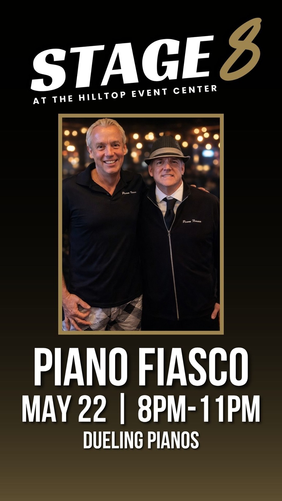 Piano Fiasco brings a high-energy dueling piano show to Stage 8, turning the night into an interactive, all-request party. With over 15 years of experience, this dynamic duo delivers a nonstop mix of classics, throwbacks, and today’s hits, all driven by crowd requests and spontaneous moments that make every show different.
